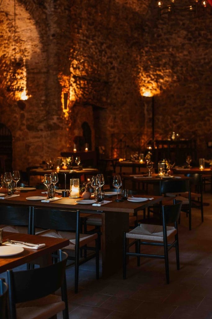 La cocina abierta añade atmósfera y una cautivadora sensación de teatro al íntimo comedor a la luz de las velas, y está acompañada de una banda sonora cuidadosamente creada. El diseño celebra la belleza natural de la capilla con paredes de piedra vista, una estatua original de madera de olivo del artista local Hormigo y la adición de aire acondicionado para mayor comodidad.