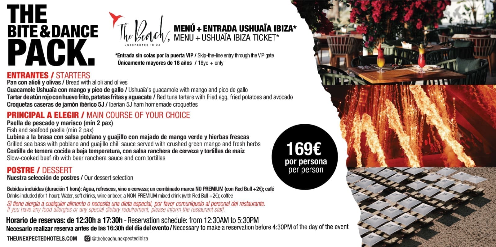 La mejor música chill-out, camas balinesas y un listado extensivo de vinos, champagne, y cócteles que redefine el significado de la elegancia, convirtiendo The Beach by Ushuaïa Ibiza en uno de los lugares más fascinantes de la isla, siendo uno de los mejores sitios para pasar el día verano tras verano. Además, ofrece un menú mediterráneo selecto y exquisito con un estilo de cocina de autor, pescado fresco y carnes a la brasa, ideal para comer o cenar.