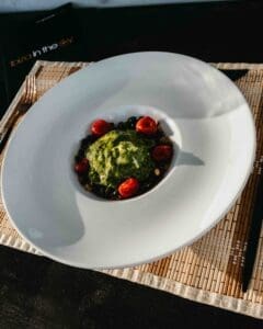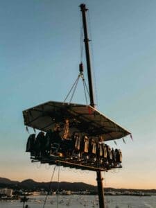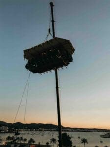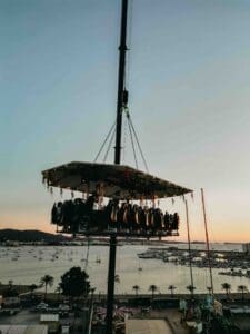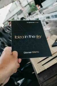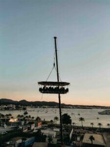 Ibiza in the Sky es el concepto gastronómico más único del mundo. Utiliza una grúa para elevar una plataforma especial con 22 invitados más el personal, hasta 50 metros en el cielo despejado de Ibiza, ofreciendo una experiencia gastronómica exclusiva con vistas al atardecer de la Bahía de San Antonio. Ibiza in the Sky ofrece 3 experiencias diferentes: tapas in the sky, dinner in the sky y DJ & cocktails in the sky.