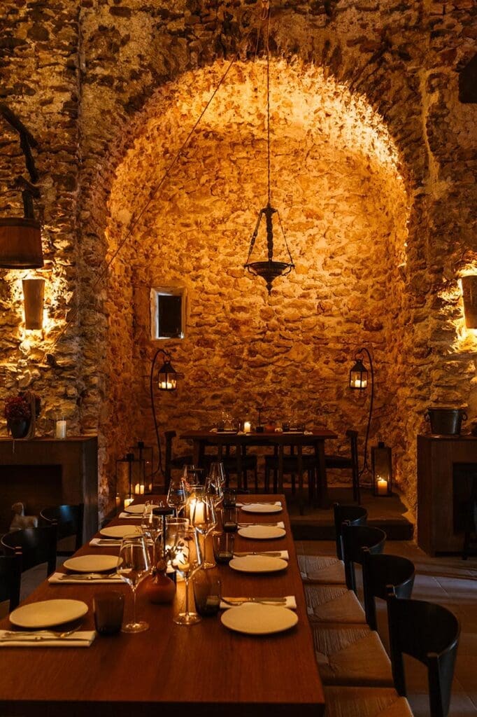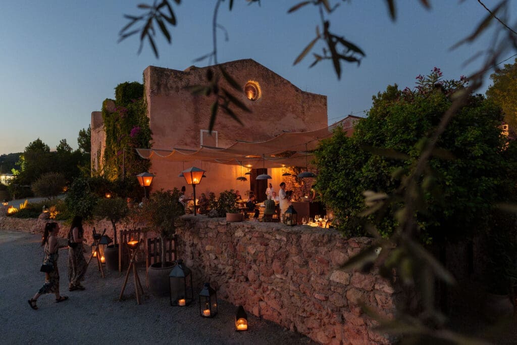 Sa Capella, a 16th-century chapel converted into a restaurant in 1978, became an iconic meeting point for the bohemian elite, hosting figures such as Freddie Mercury, Montserrat Caballé and Juan Carlos I. It has now reopened, restored by the Anadon family, creators of renowned venues such as Café Mambo. Located in the hills above San Antonio, it offers a product-driven cuisine featuring local seafood and carefully selected meats grilled over open fire. The interior blends an open kitchen, soft lighting, and an intimate atmosphere while preserving the original architecture. Outside, a palm-lined terrace evokes a private garden with a cocktail bar. The experience is completed with signature cocktails and a refined selection of Balearic and international wines.