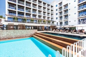 Ocean Drive Talamanca is located in one of the best areas of Ibiza. Its privileged location in Talamanca Bay, known for its beauty, tranquility, and proximity to Ibiza Town, offers excellent views of the Mediterranean Sea, the UNESCO World Heritage Old Town (Dalt Vila), and some of the island’s most beautiful sunrises. The beach is just a few steps away, and within a short time you can reach the most exclusive marinas, the city center, and the trendiest nightclubs.Talamanca is a haven of peace and serenity in the heart of Ibiza, right by the sea. While the island moves to an intense rhythm day and night, Talamanca is the area reserved for relaxation and enjoyment. Bathed by the Mediterranean Sea, Talamanca Bay features a sandy beach with restaurants such as Almar, where you can dine right on your sunbed or enjoy a rice dish at tables set beneath the shade of pine trees.